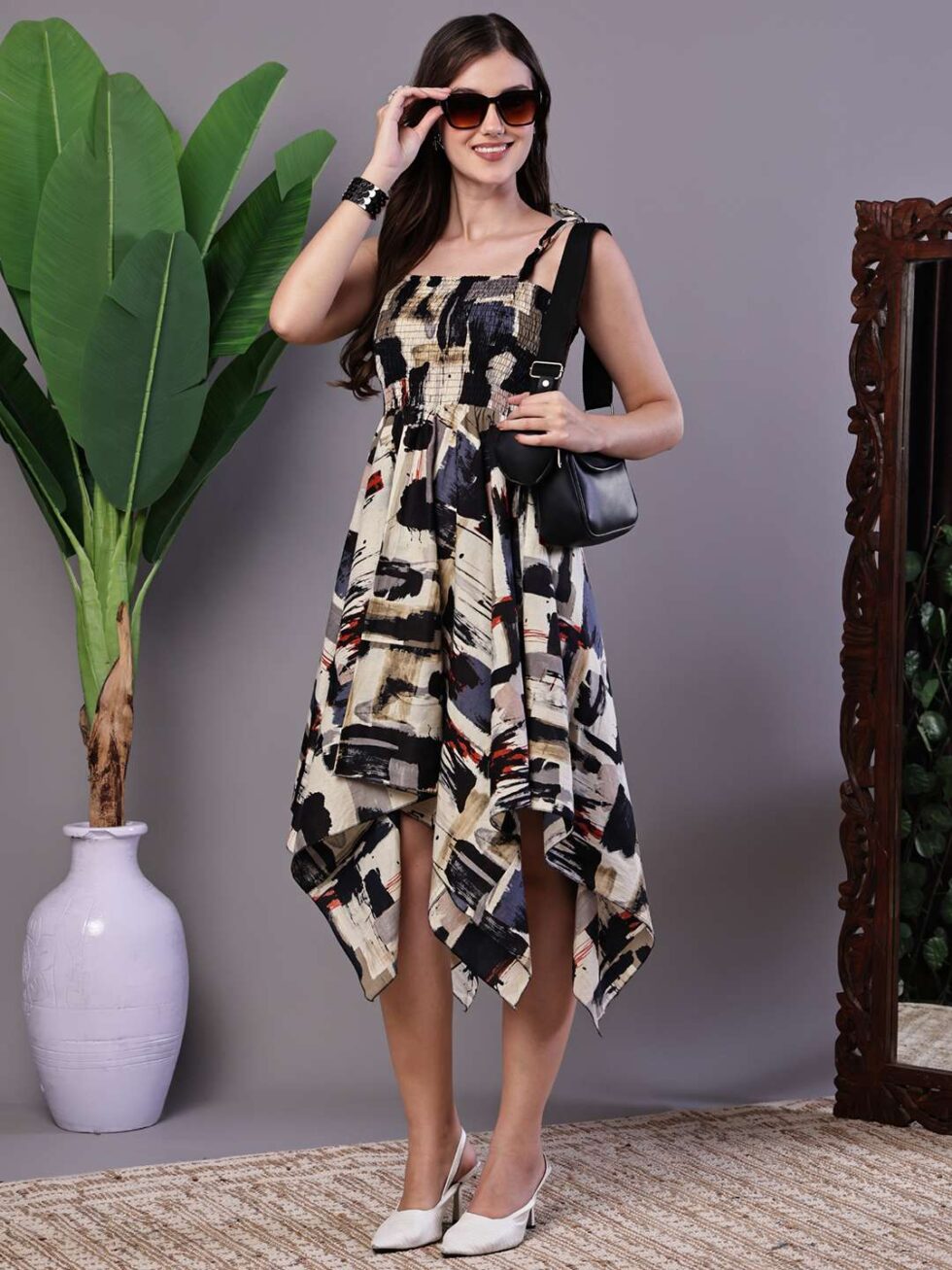 Women’s Abstract Print Smocked Asymmetrical Hem Dress Midi Dresses