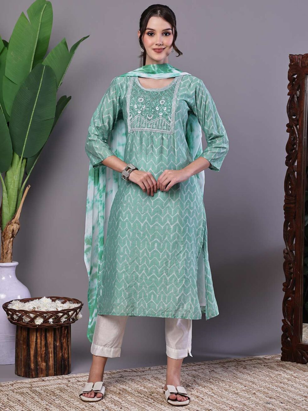 This ensemble is an elegant and vibrant ethnic kurta set, ideal for celebrating festive occasions or for smart casual wear. The straight-cut kurta features an eye-catching, all-over print, beautifully contrasted by a detailed square neckline. This neckline is the focal point, adorned with intricate sequin and zari embroidery that lends a touch of traditional glamour. Paired with crisp, solid white trousers and a coordinating dupatta, the outfit offers a complete, polished look with a comfortable, flattering A-line silhouette and classic 3/4 sleeves. This set perfectly balances traditional artistry with modern wearability.